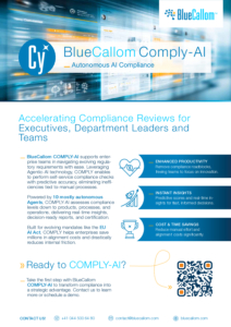 BlueCallom COMPLY-AI turns a regulatory obligation into a strategic advantage by making compliance predictive, self-service, and cost-effective, thus helping businesses stay compliant while driving innovation and efficiency.